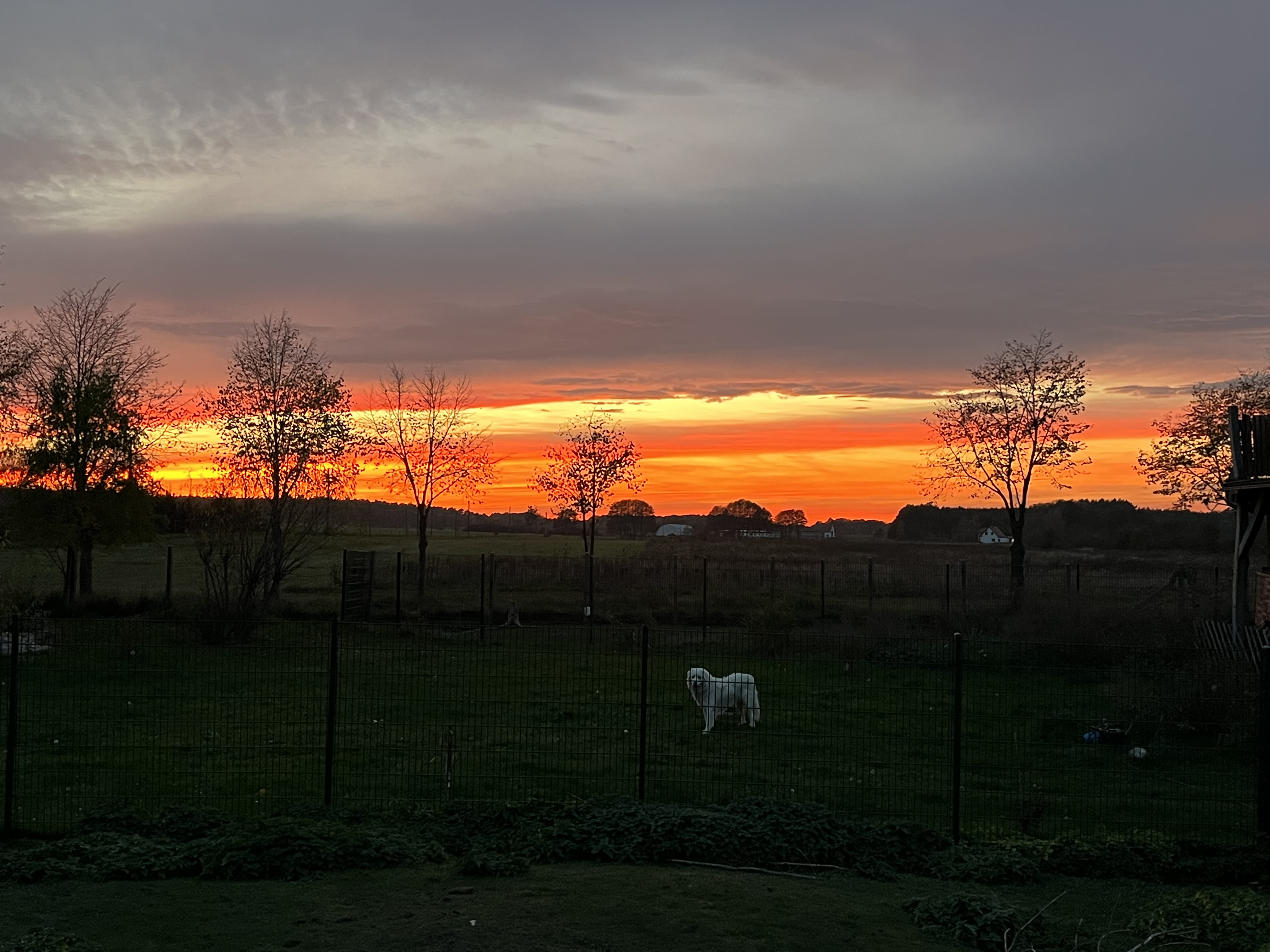 November-Sonnenuntergang über unserer Wiese mit Rudi