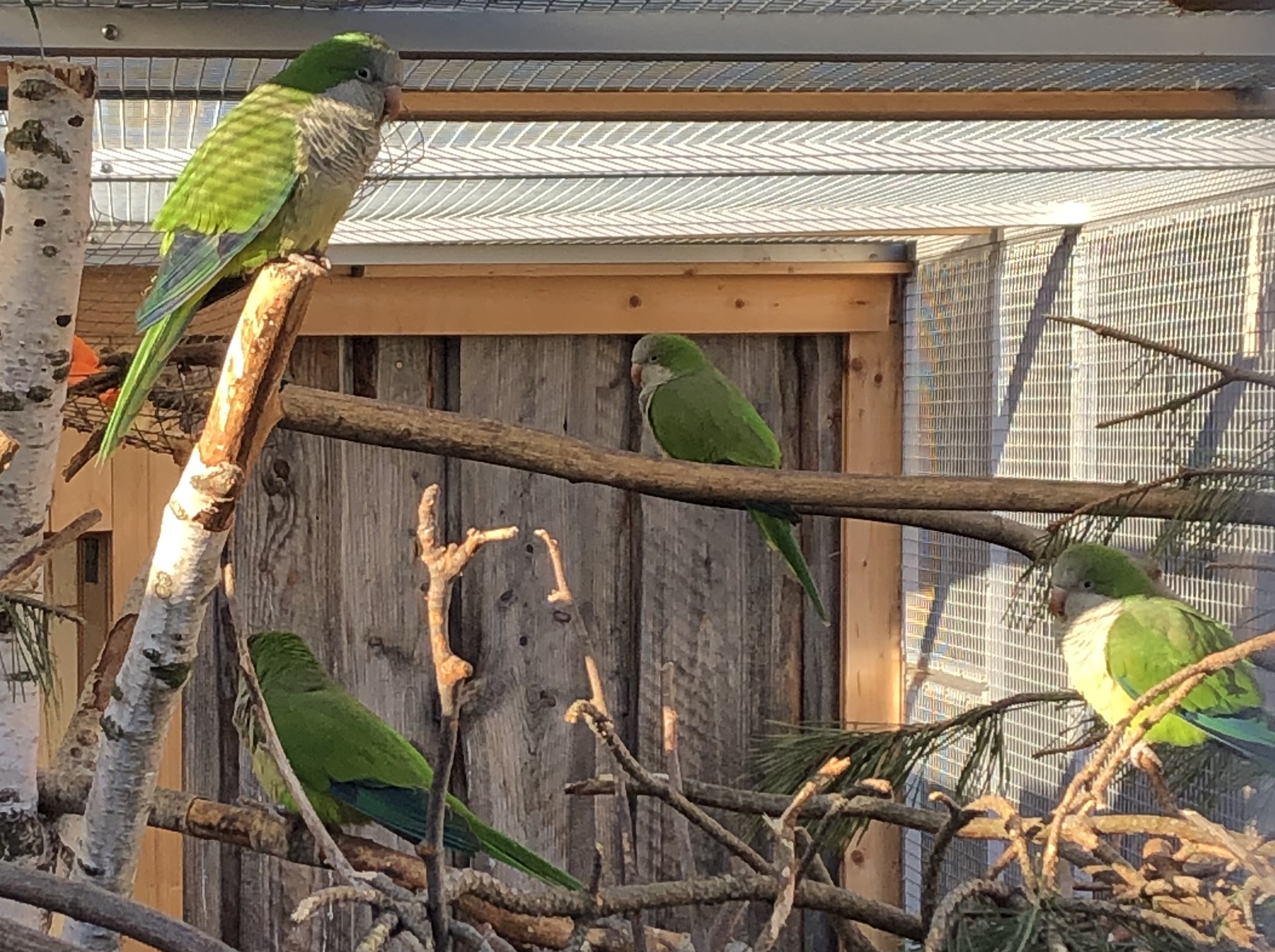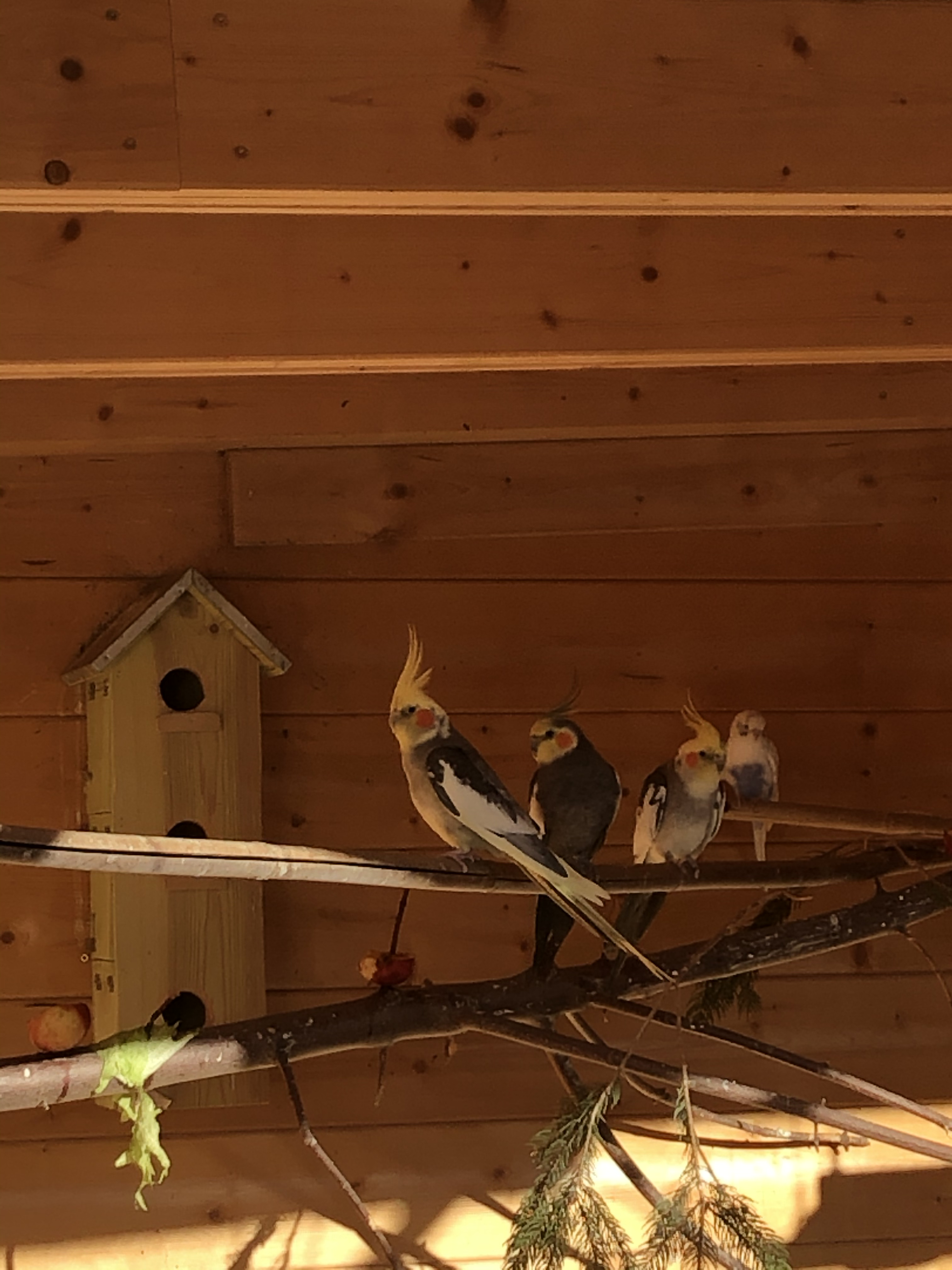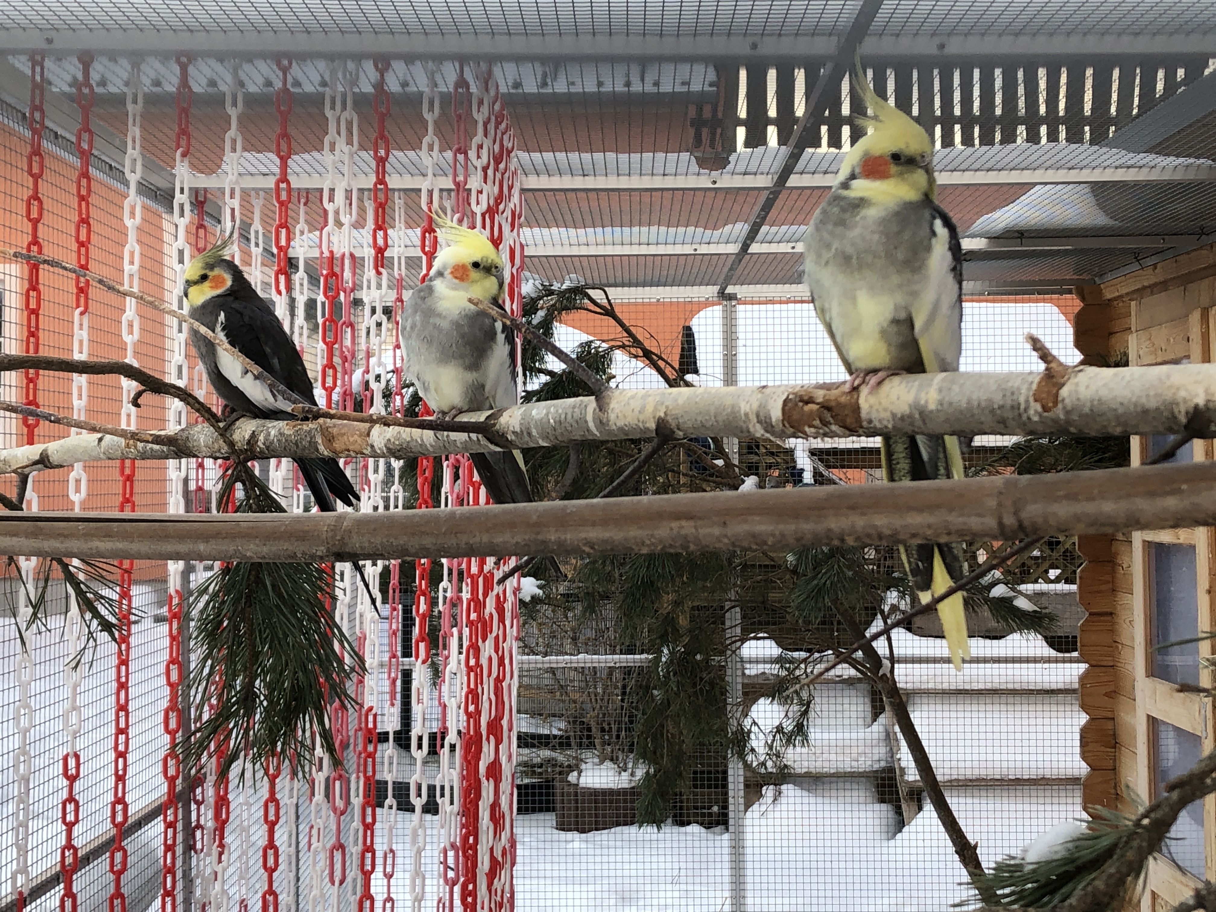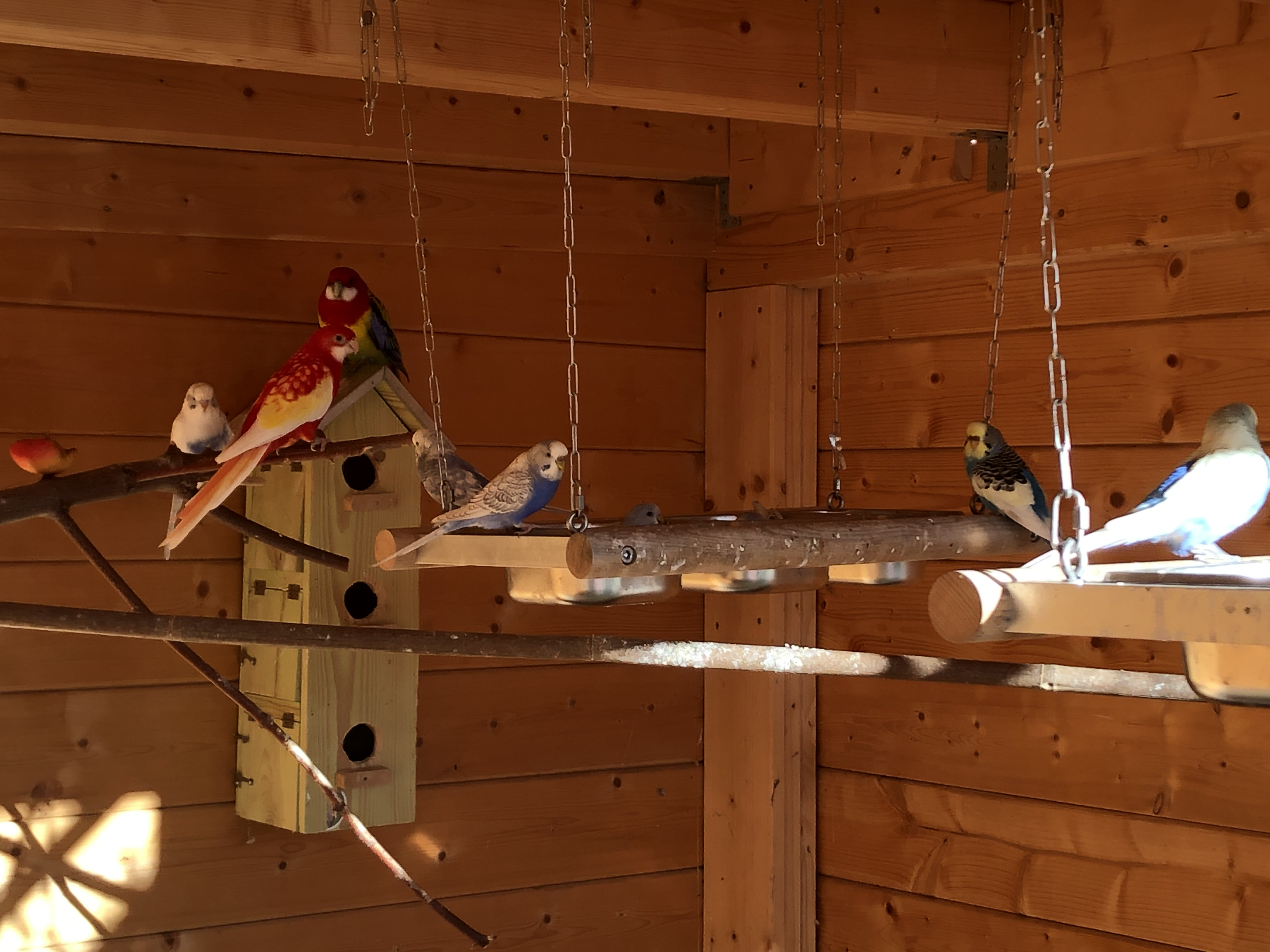 Die Nymphensittiche könnten auch in den Schutzraum fliegen. Er ist immer zugänglich und warm.