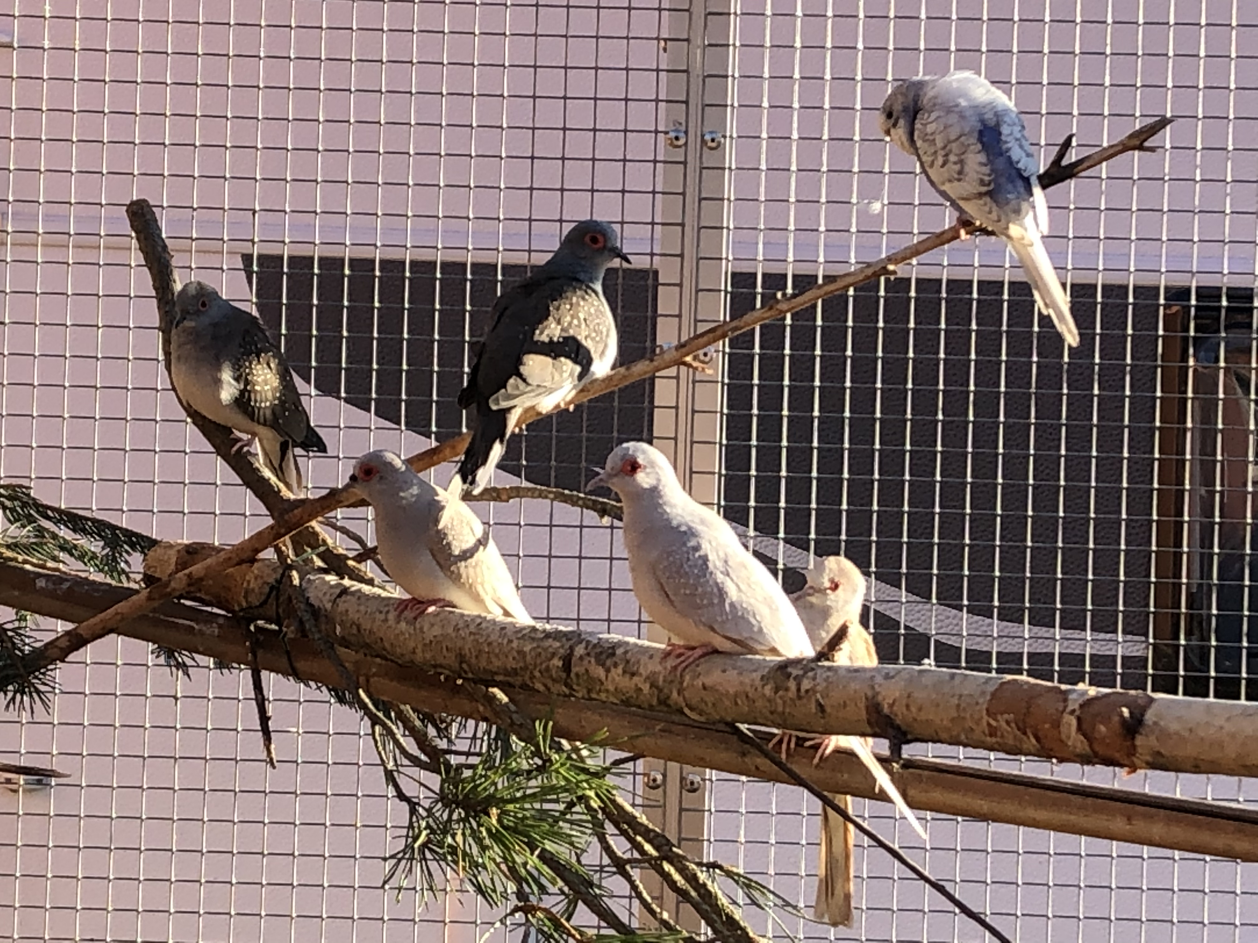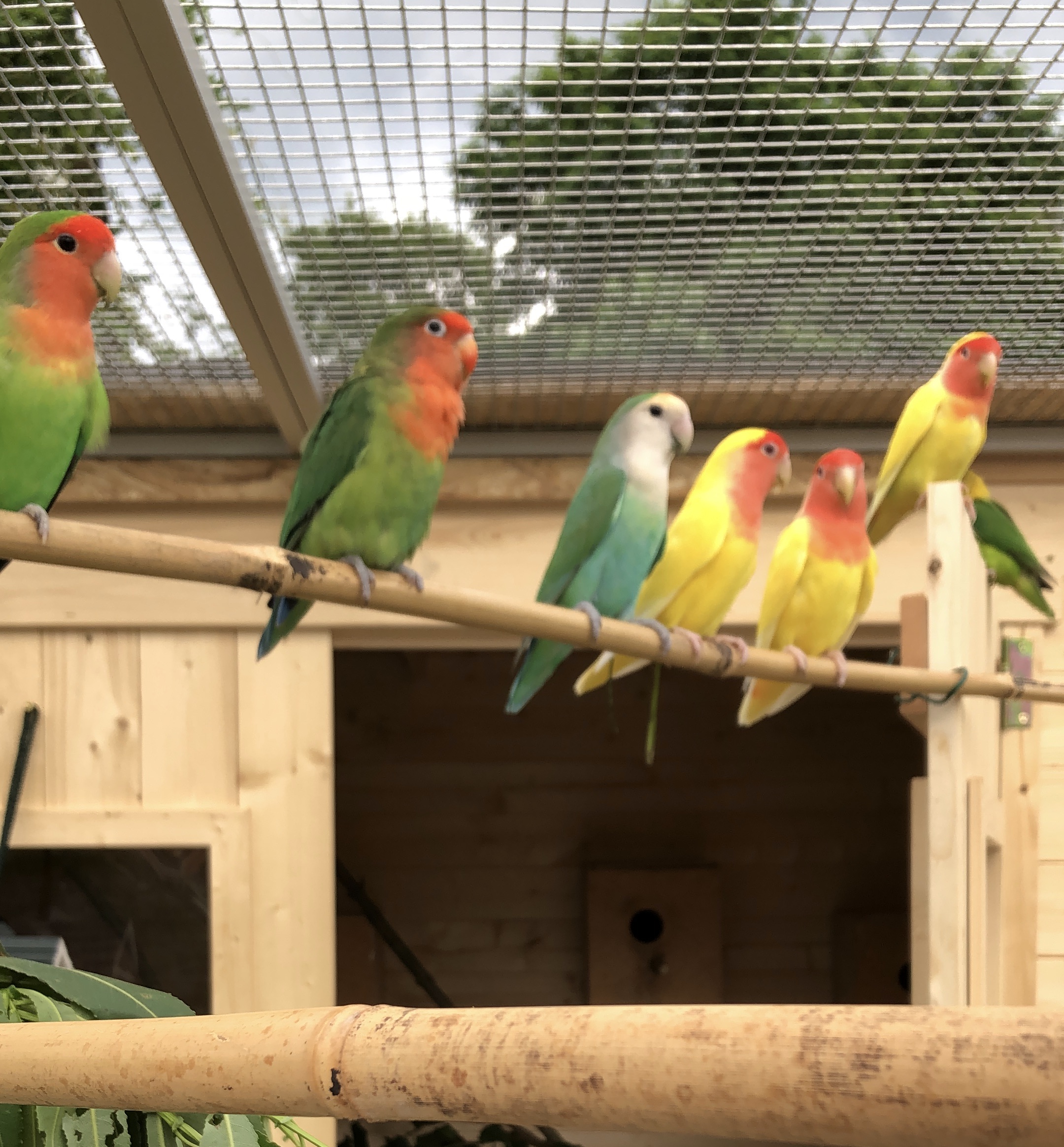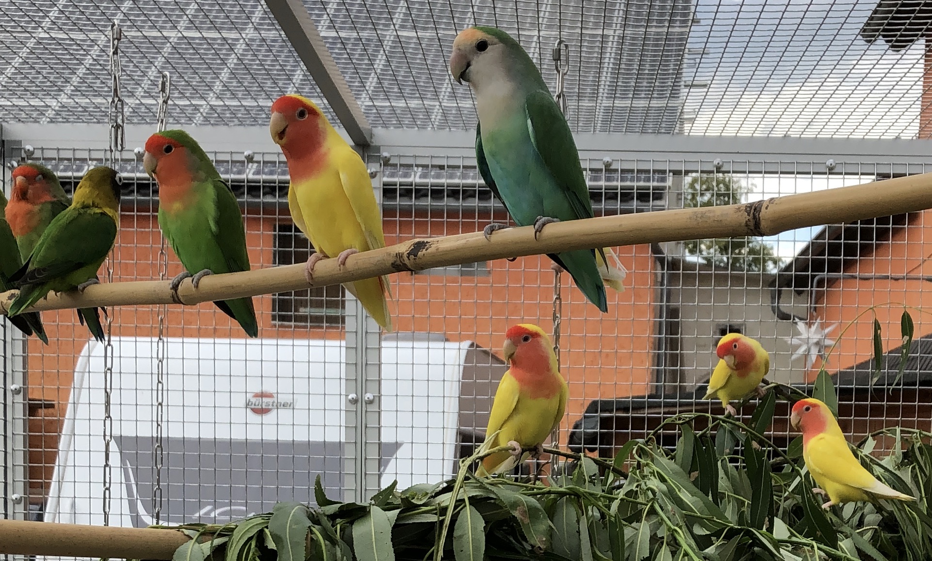 3) mit Nymphensittichen, Wellensittichen, Prachtrosellas, Diamanttäubchen und Wachteln