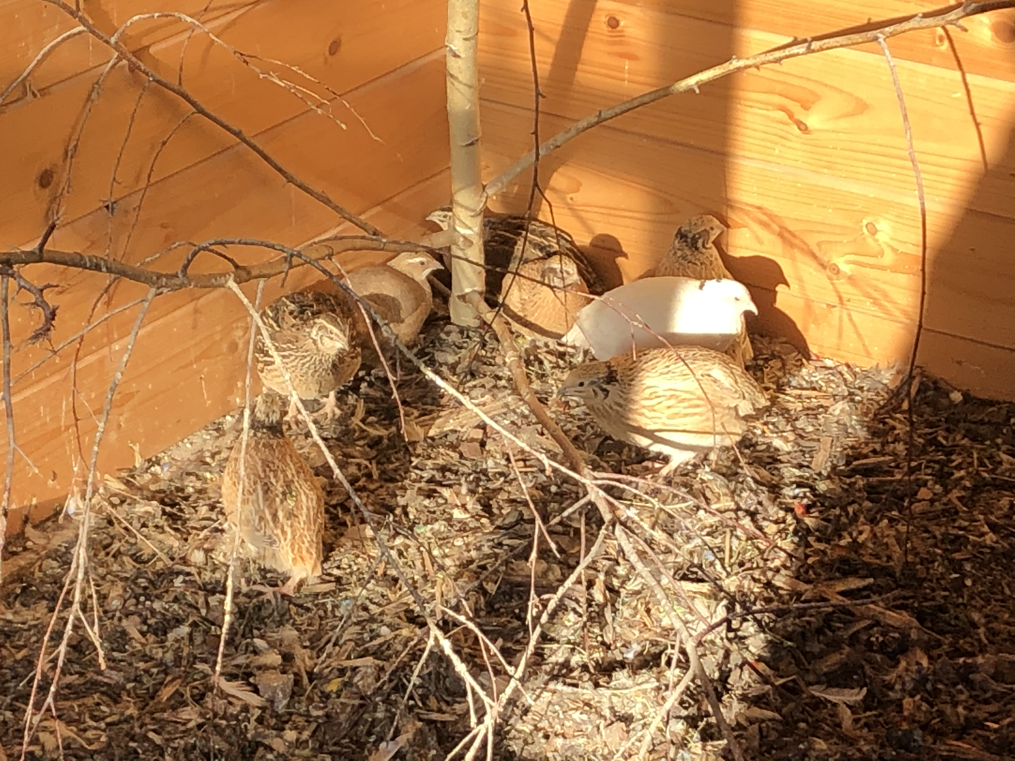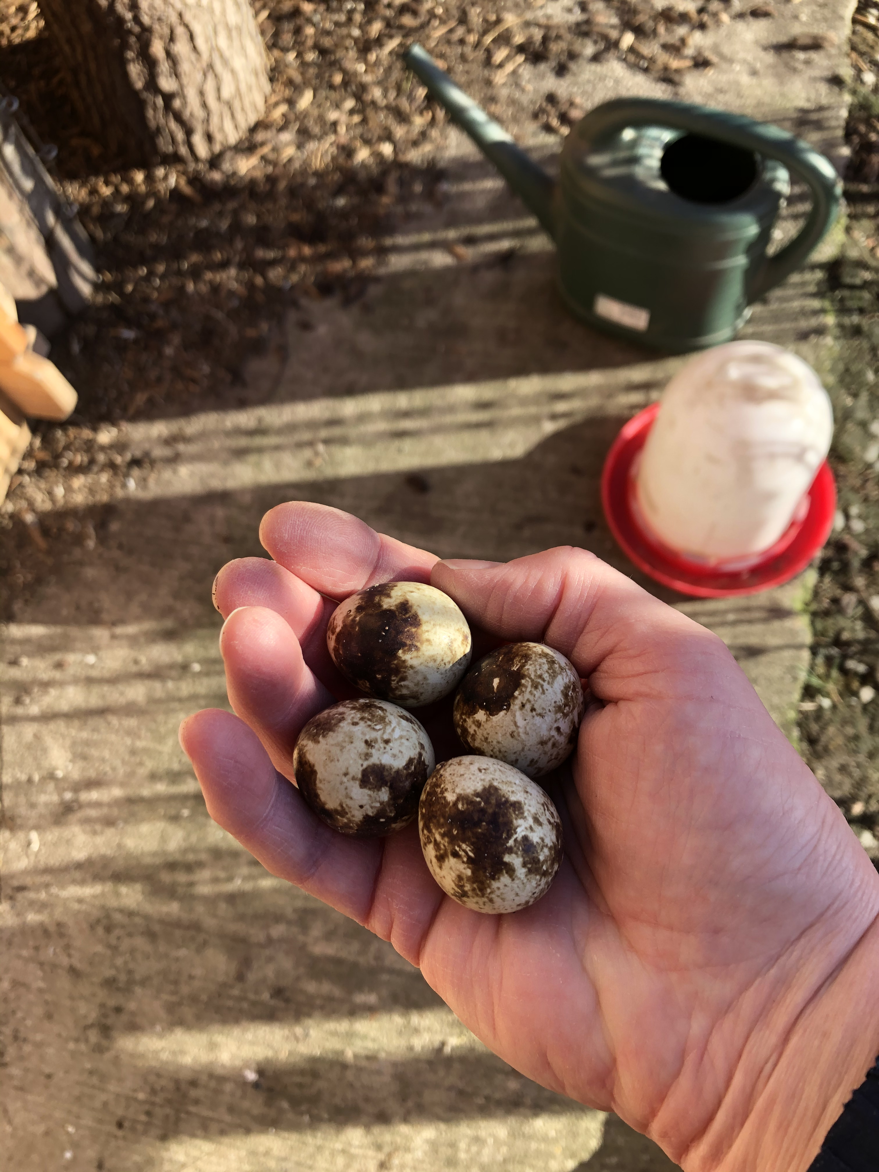 ein paar Wachteln im Schutzraum / unten: Wachteleier