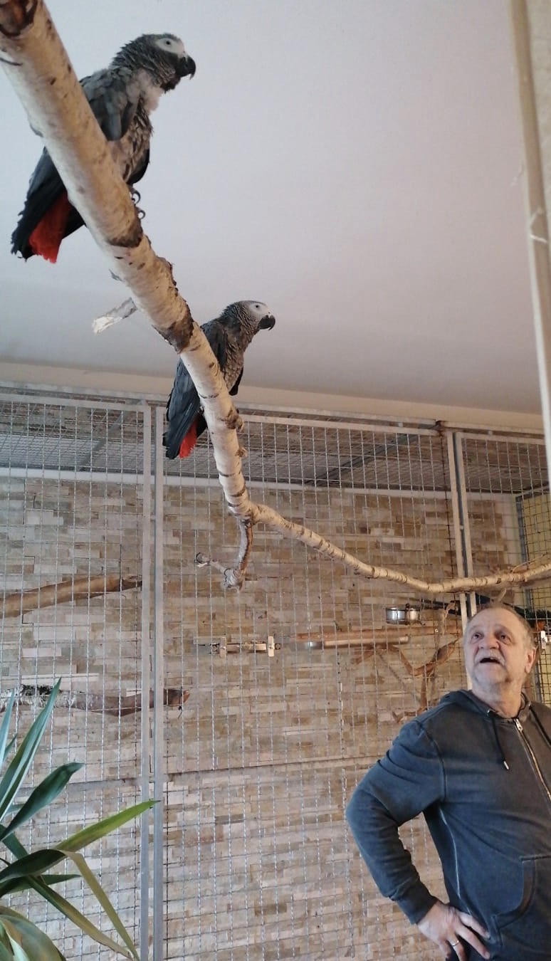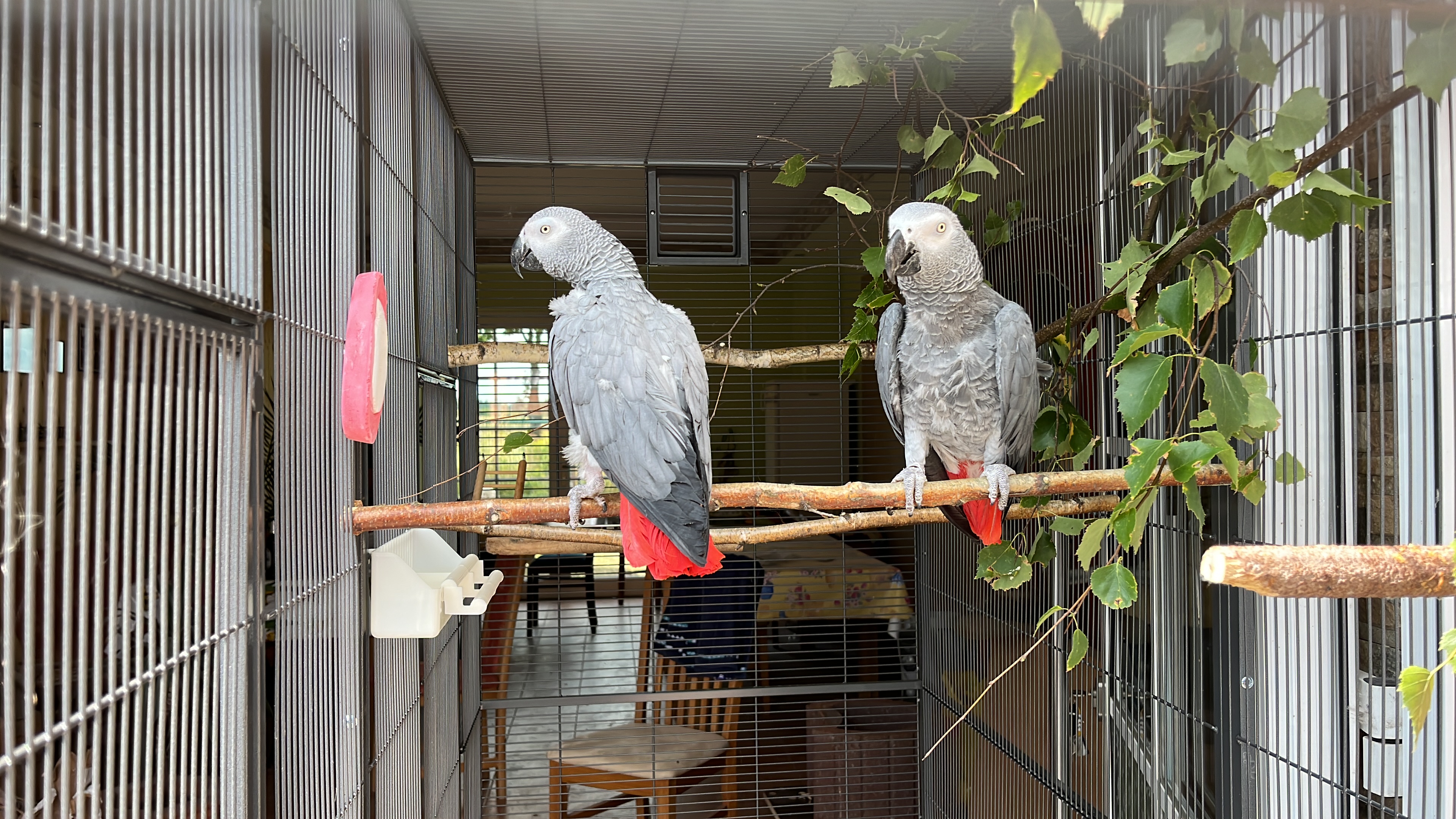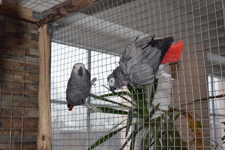 In einem abgetrennten, warmen Raum hat ein Pärchen Graupapageien (Frieda und Felix) sein Zuhause.