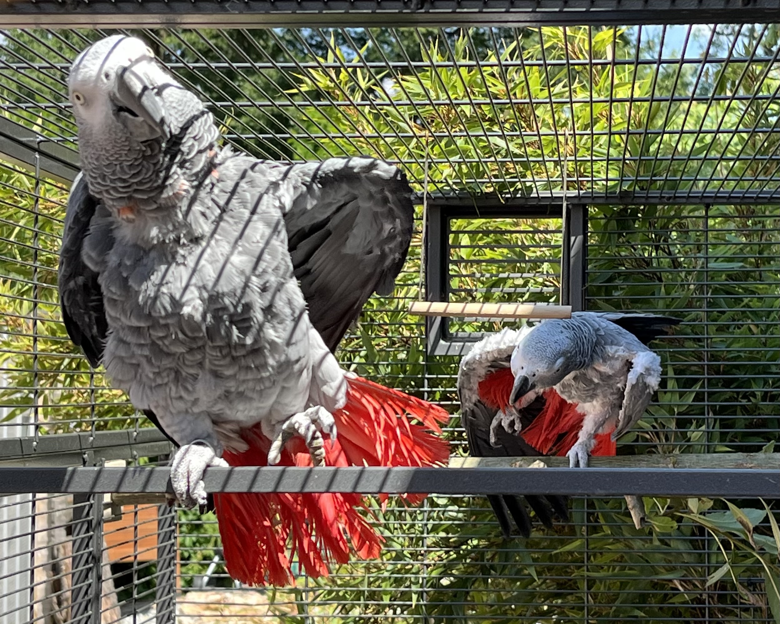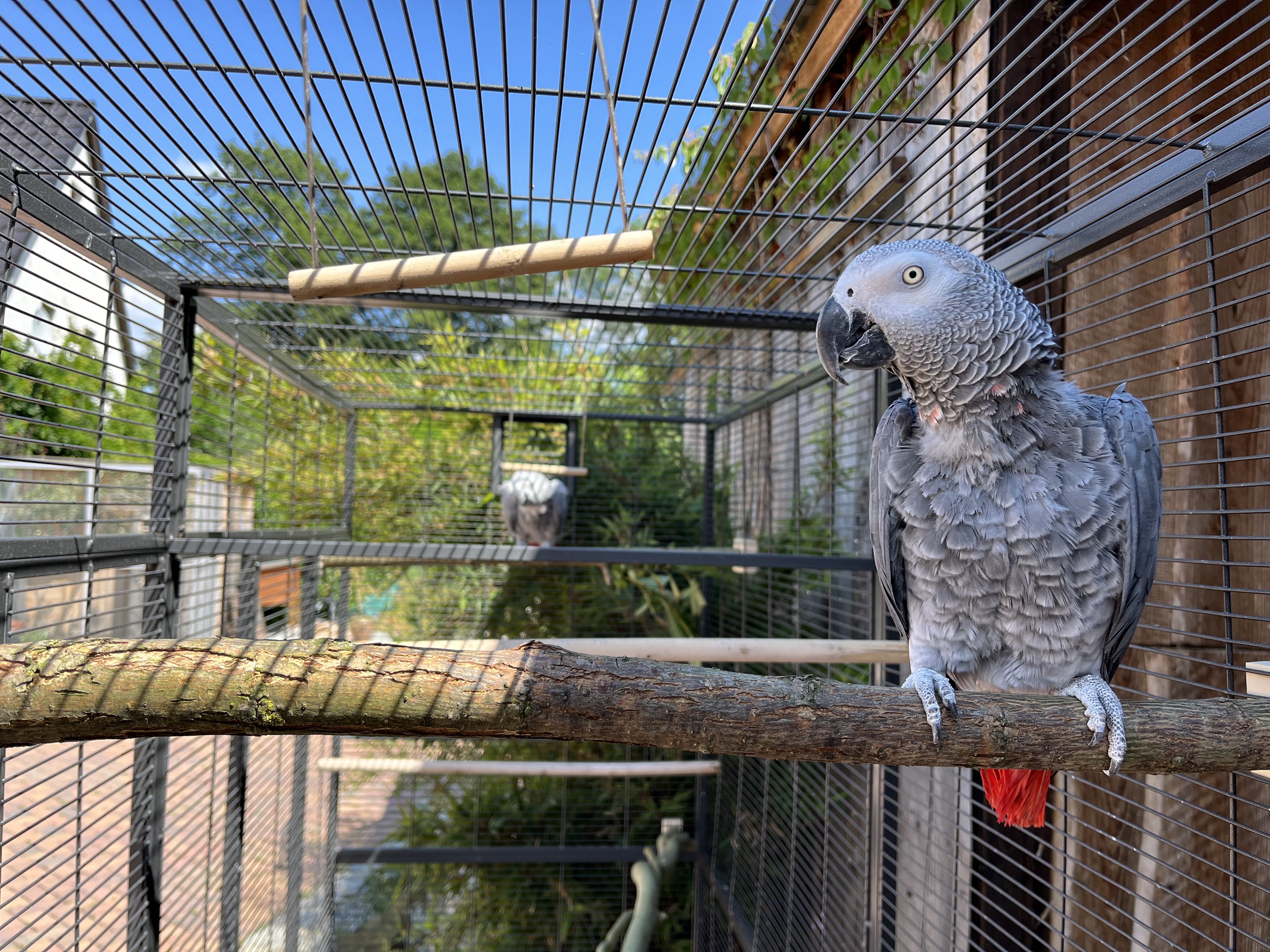 Die Graupapageien Frieda und Felix pfeifen (oder miauen) in den schönsten Tönen ... und bei geöffneten Fenstern oder Tür quer über den Hof.