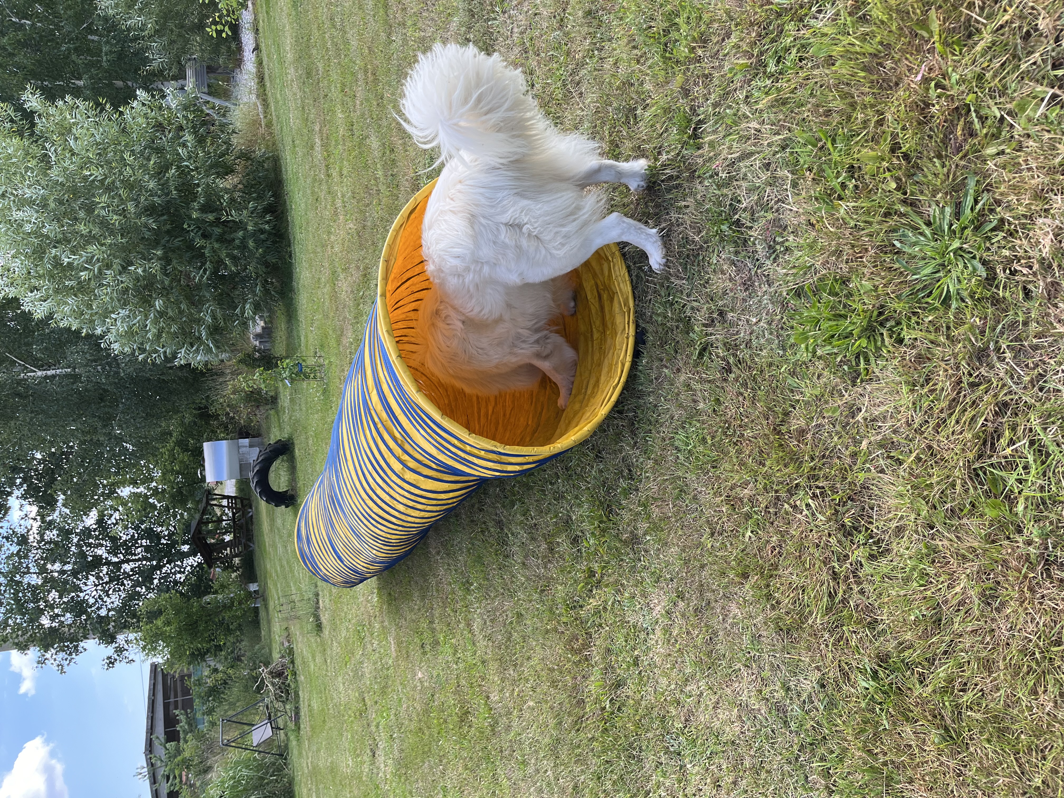Unser Hund Rudi hat seinen eigenen umzäunten Bereich. Weil er aber mit allen Hunden, egal ob groß oder klein, gut auskommt, kann er gern mit Ihrem Hund auf der großen Wiese zusammen spielen.