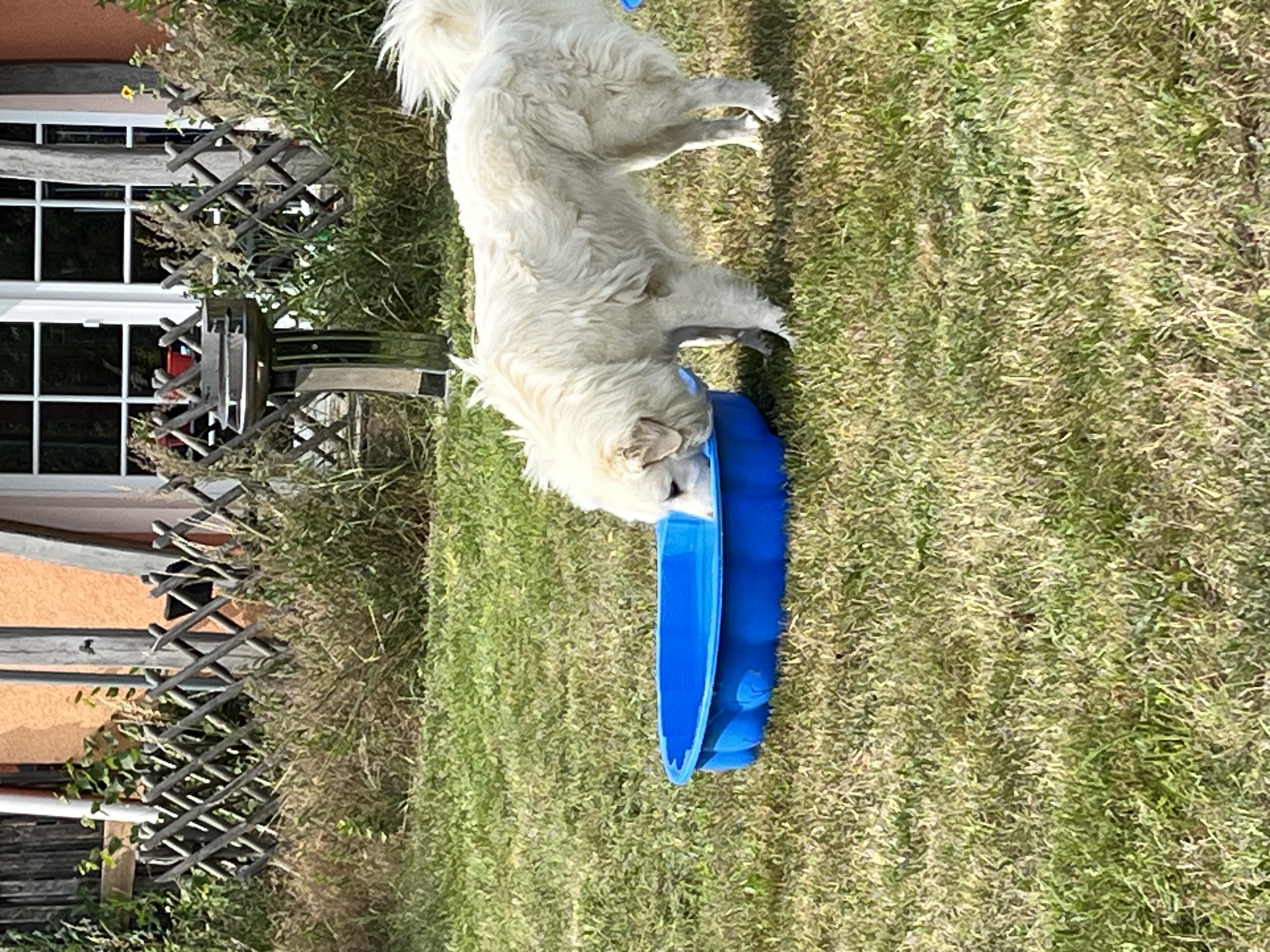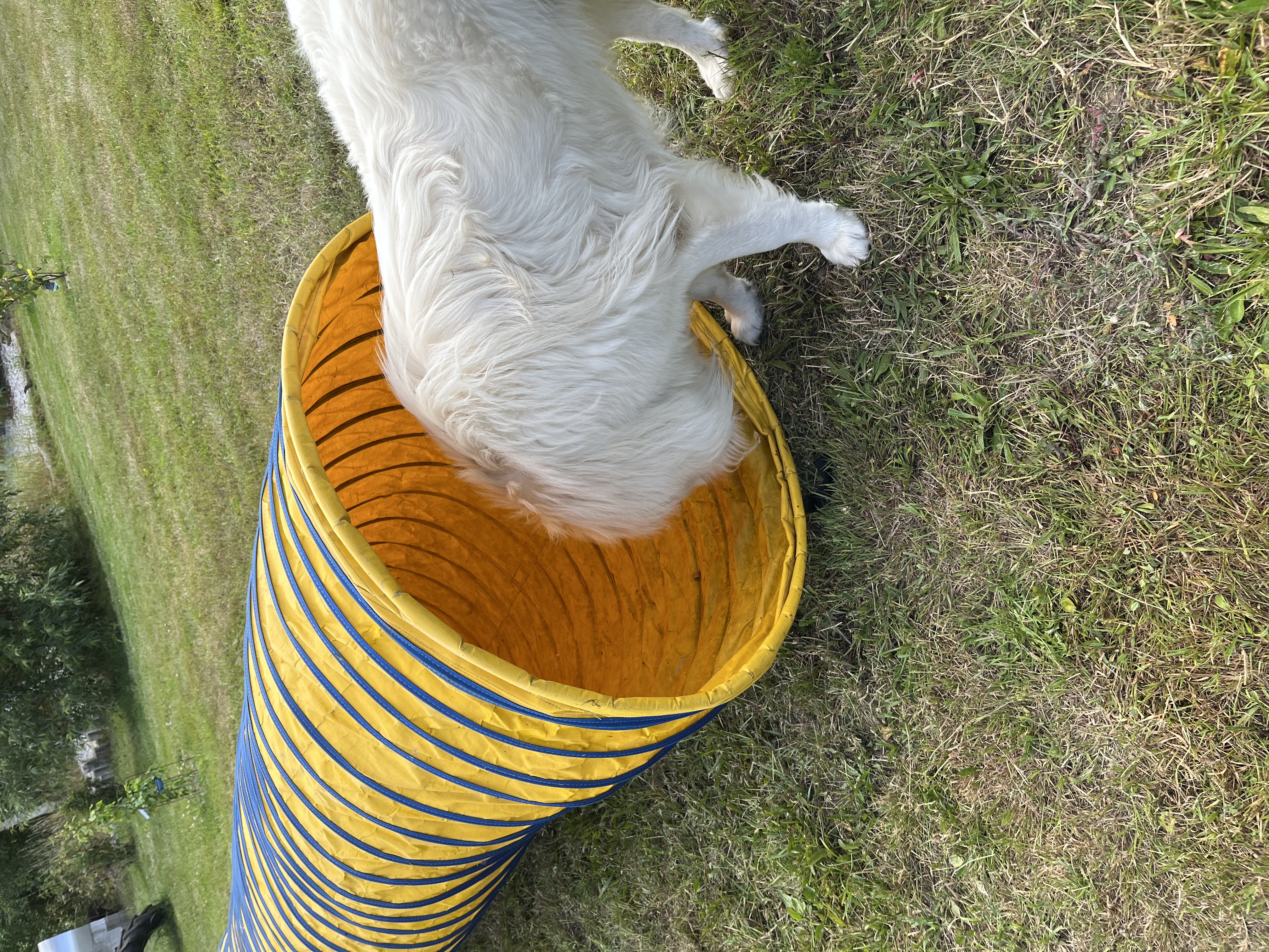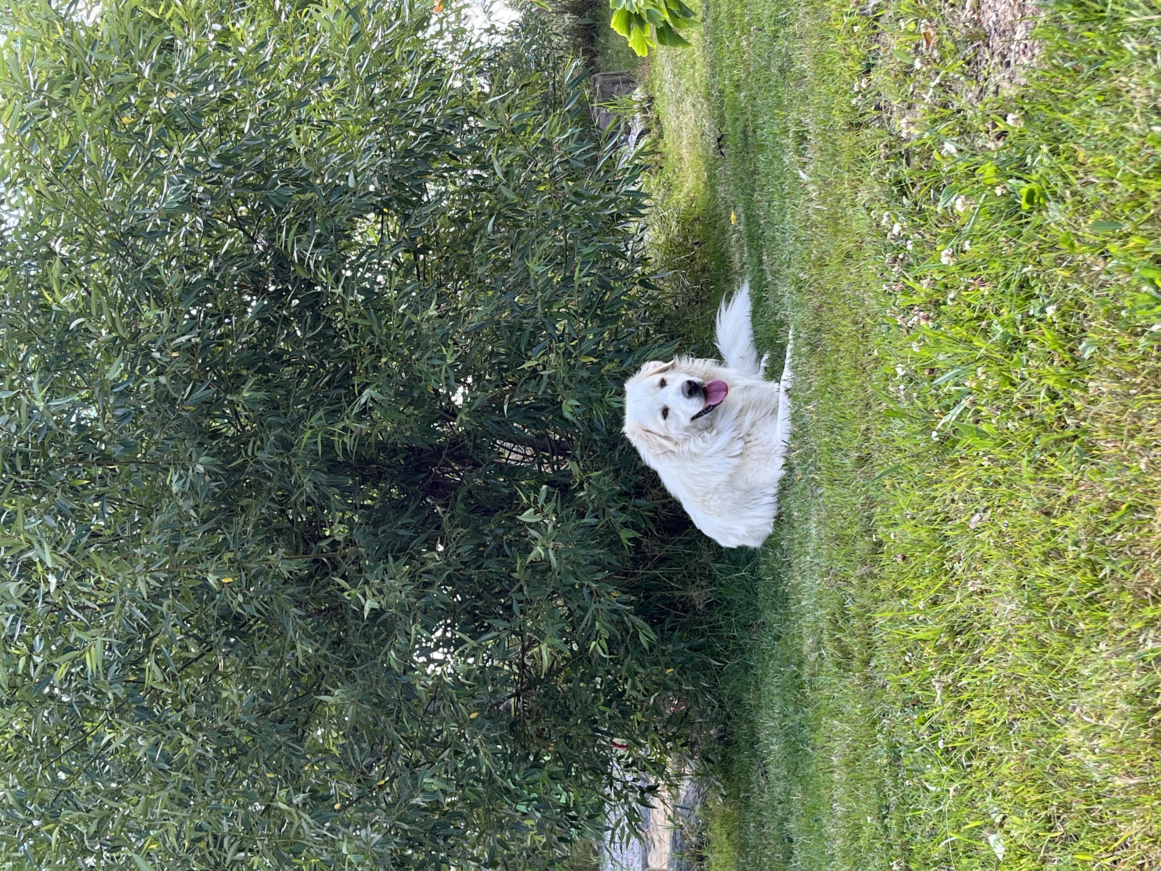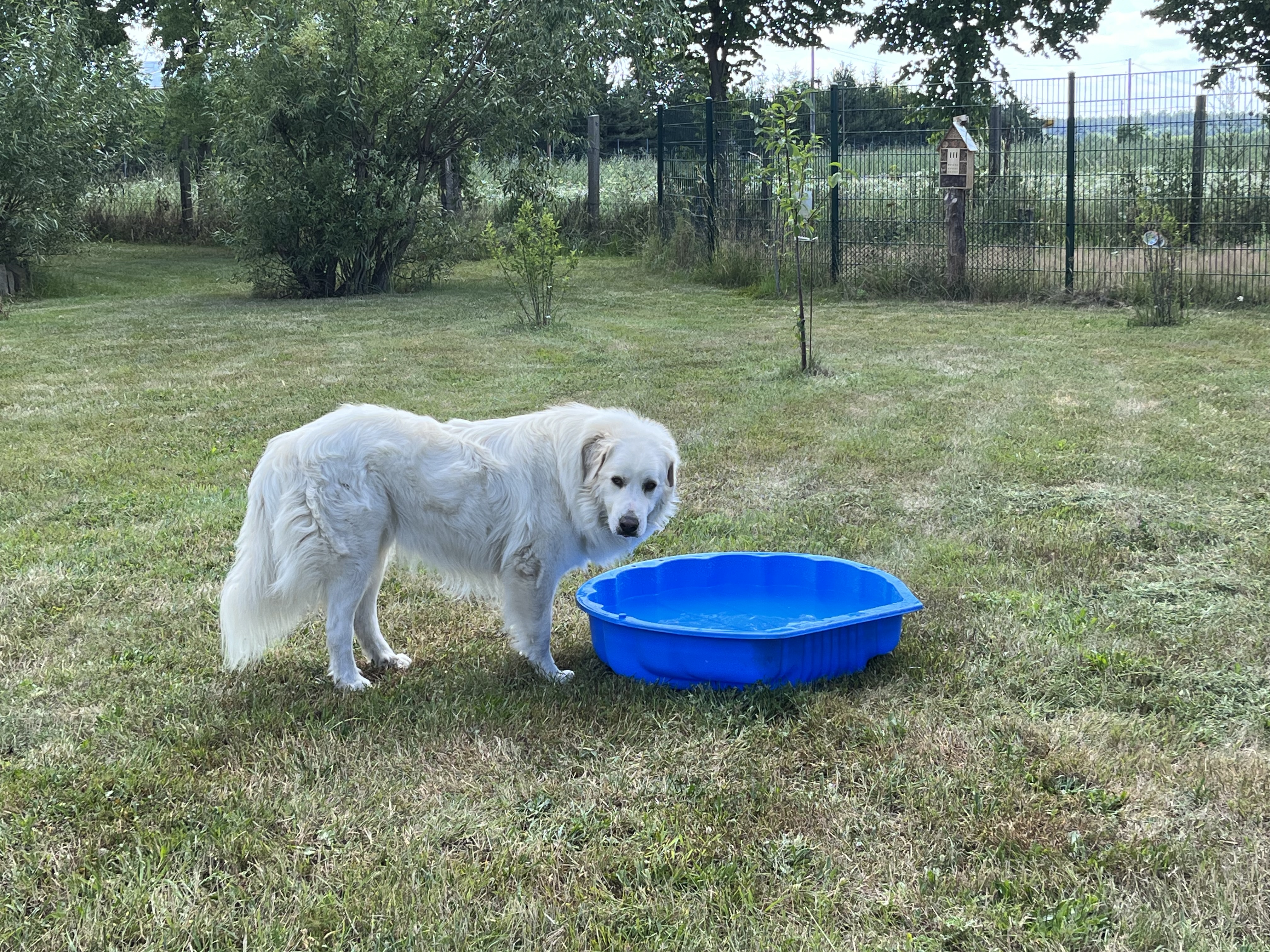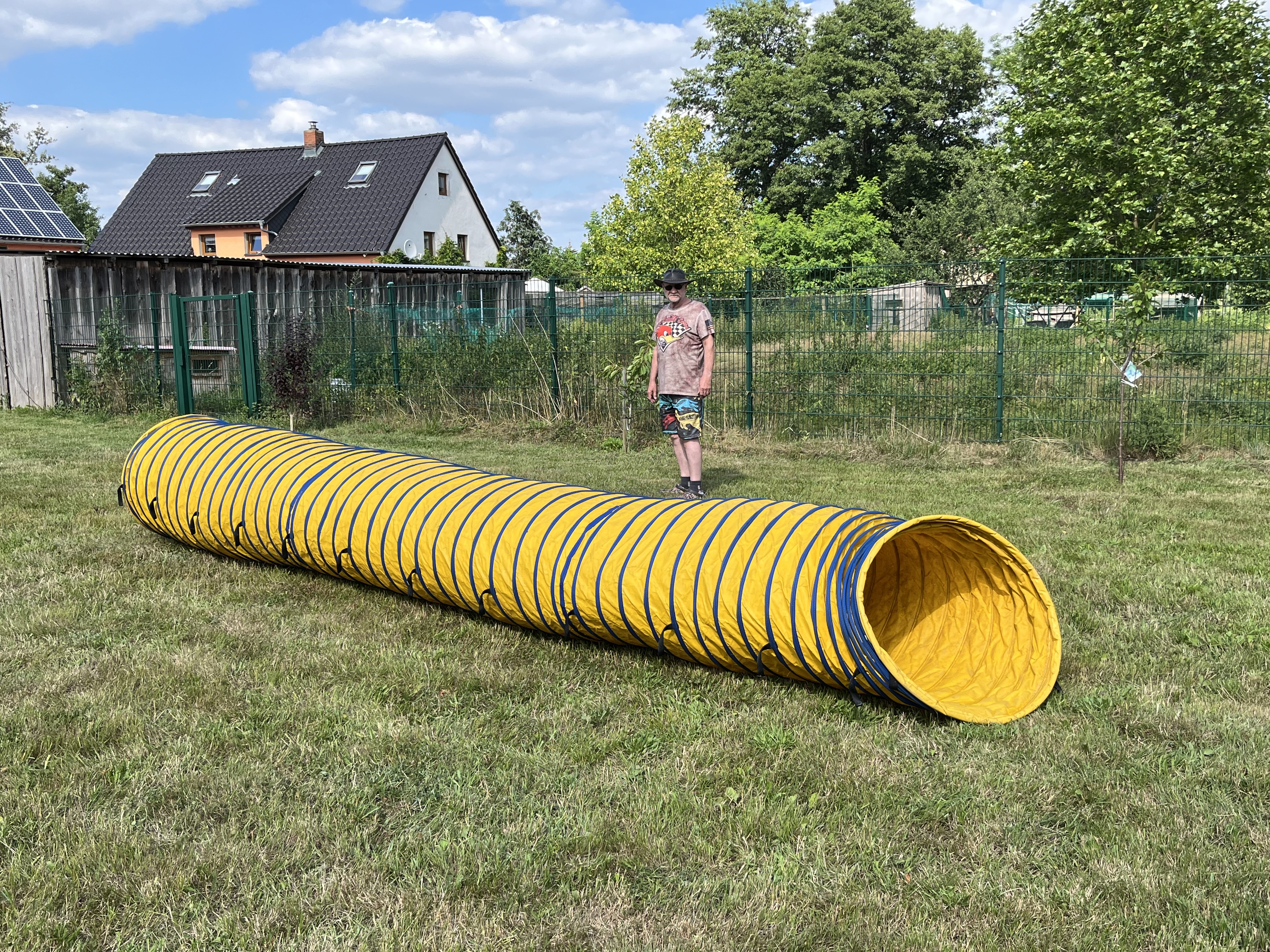- Auf der 1,80 m hohen umzäunten Wiese findet Ihr Liebling Schattenplätze, bei Bedarf eine mit Wasser gefüllte Muschel und auch einen für große Hunde geeigneten Agility-Tunnel.